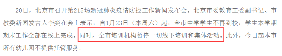 近期随着各地疫情再次出现,已有多地有关部门发文要求暂停各类线下培训活动,颇有山雨欲来风满楼之势。据统计,截至1月20日凌晨已有至少35地(包括市、县、地区)发布相关暂停线下学习活动与各类培训线下课程的通知。北京市教委也于近日下发通知,自本周六(1月23日)起,全市校外培训机构线下培训暂停。