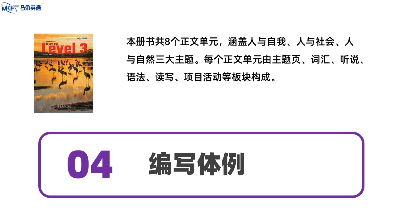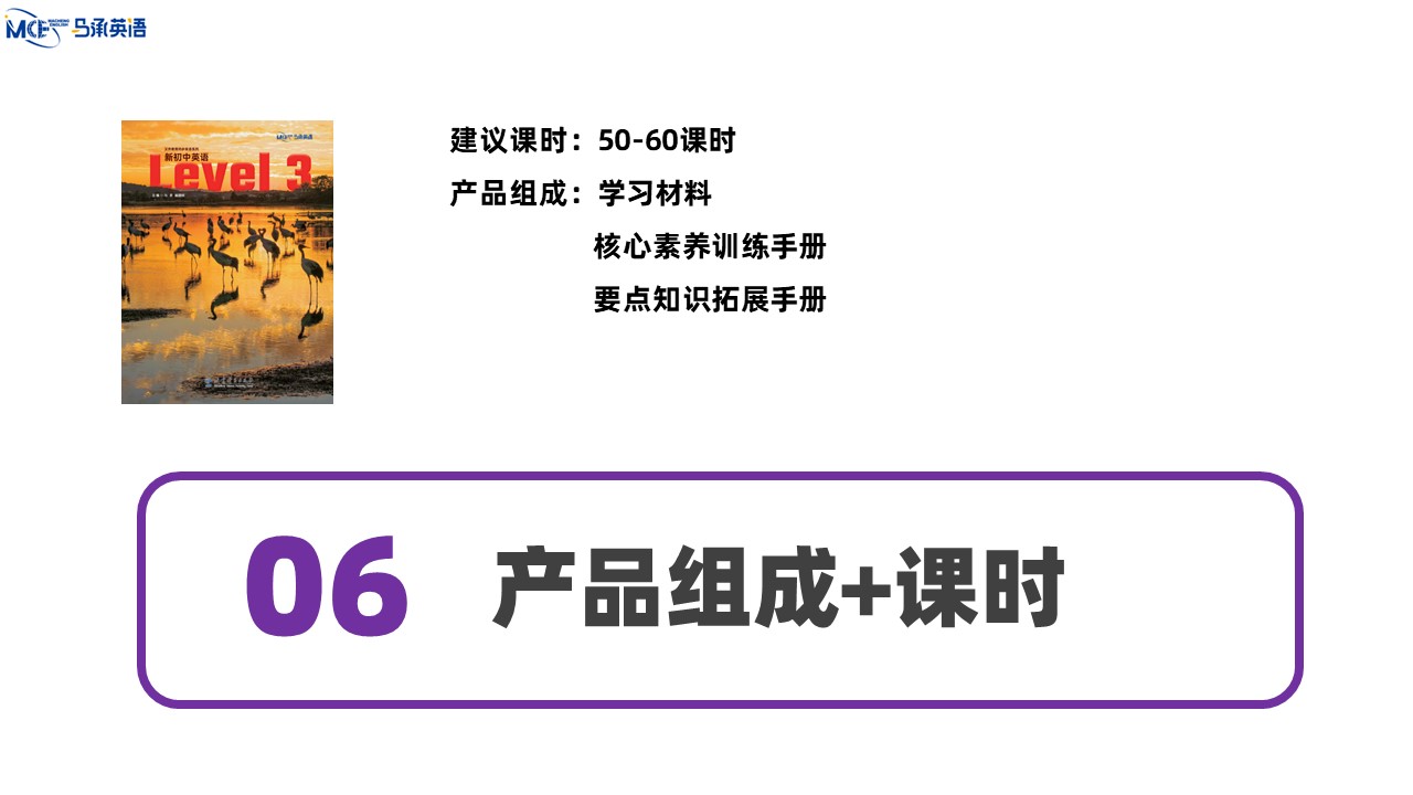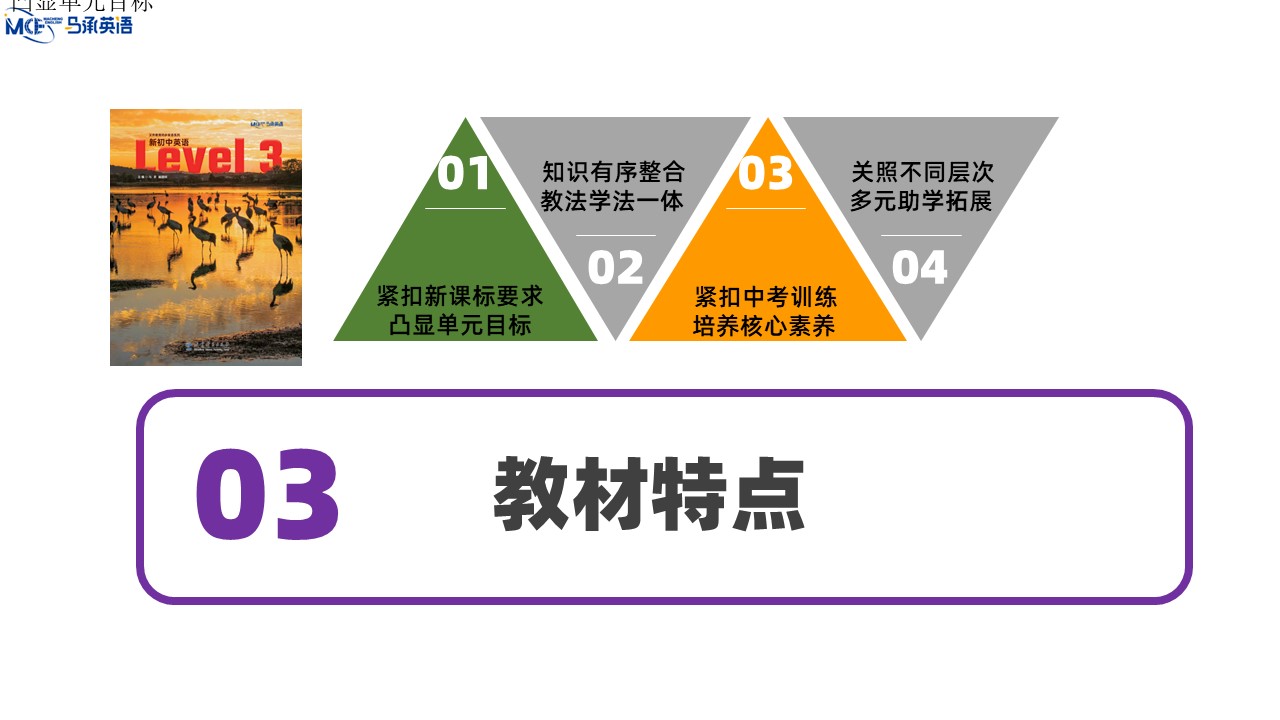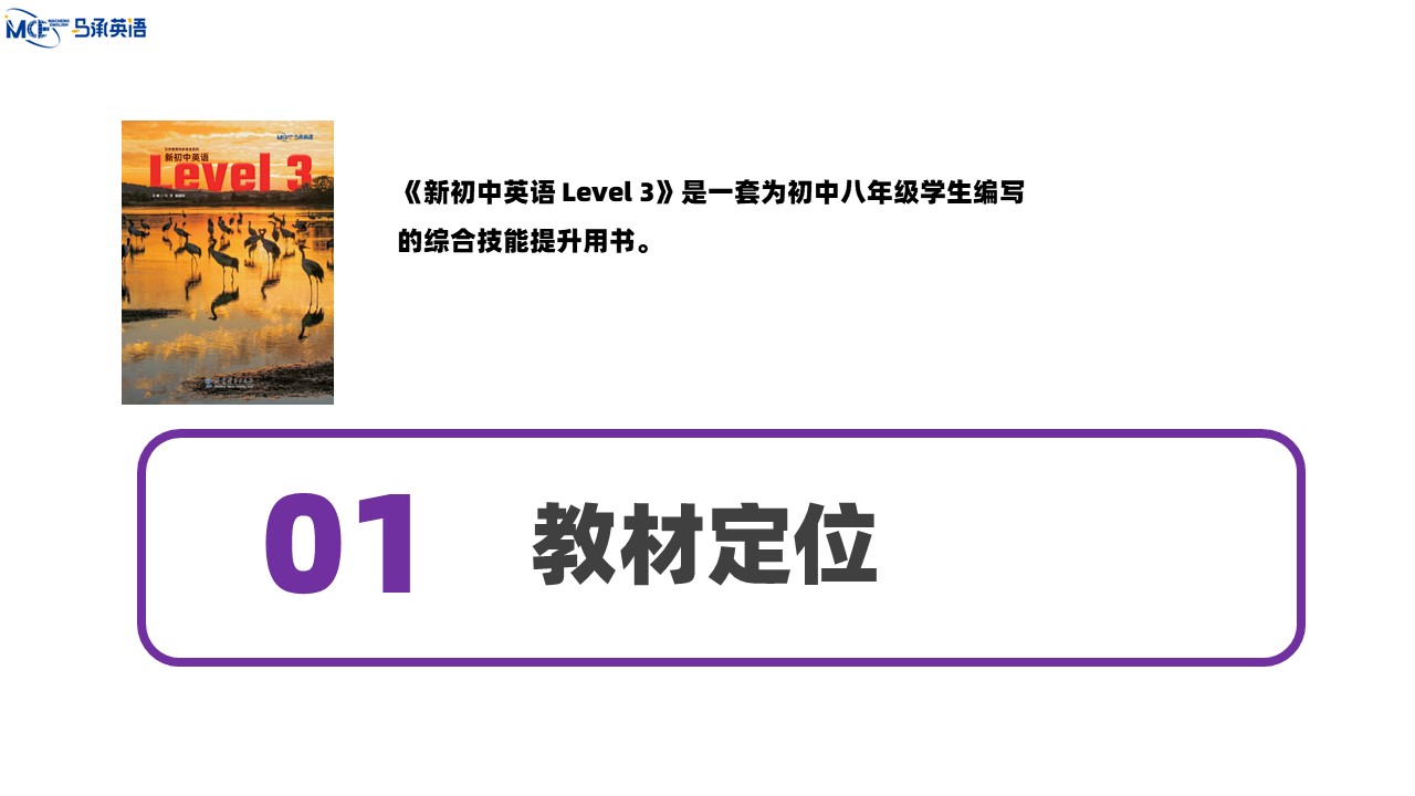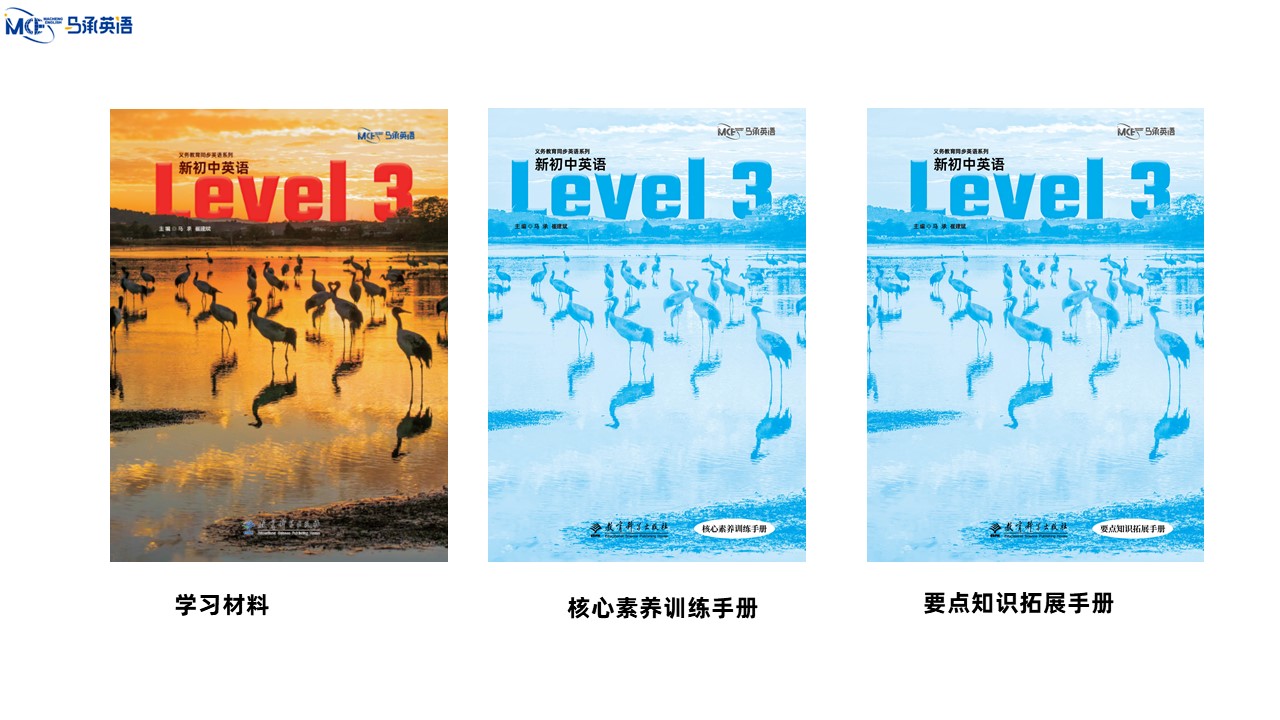 教材主编:马承 崔建斌 出 版 社:教育科学出版社 使用对象:初中八年级学生 课时安排:50课时 全套定价:82.00元 衔接教材:《新初中英语》Level 2——本套教材——《新初中英语》Level 4