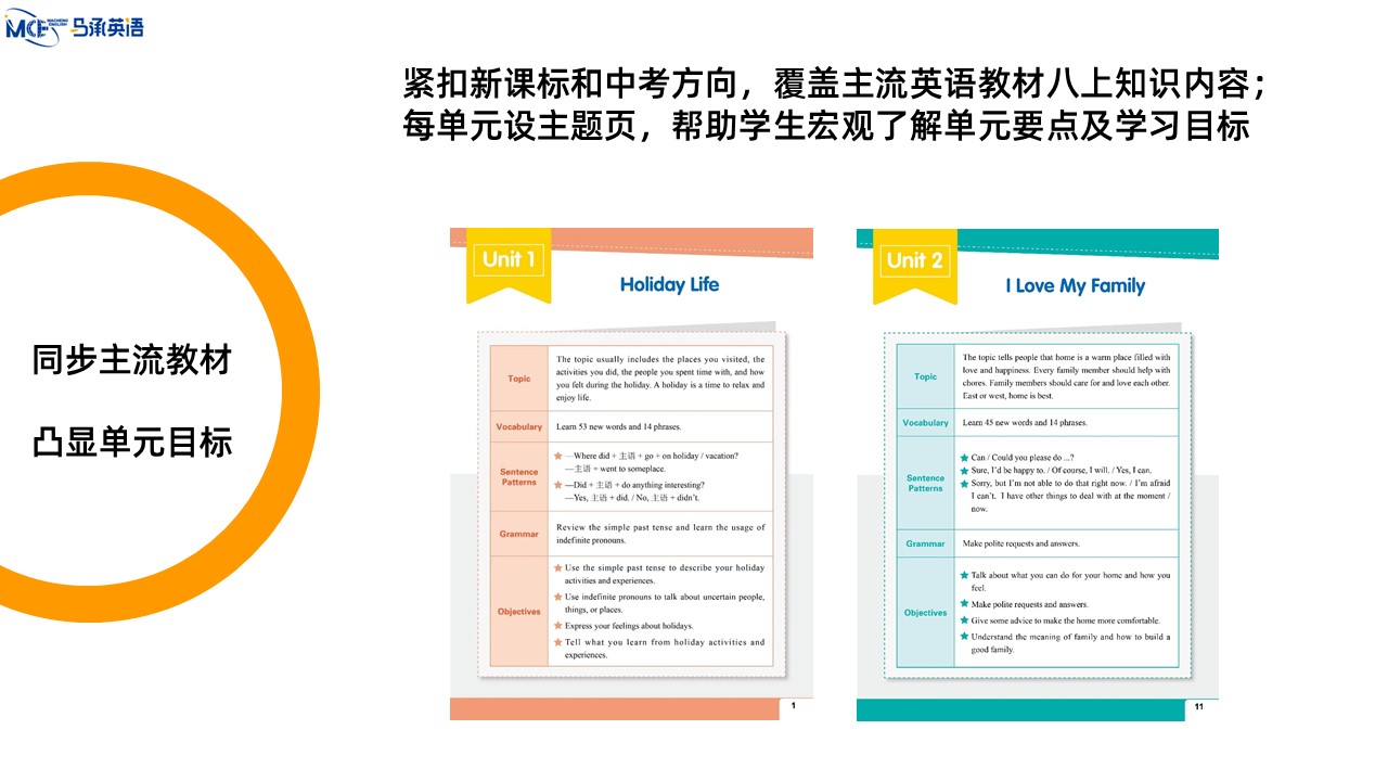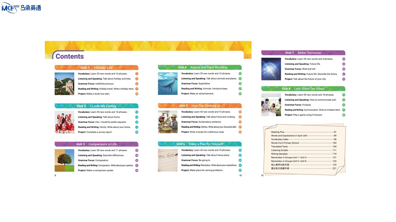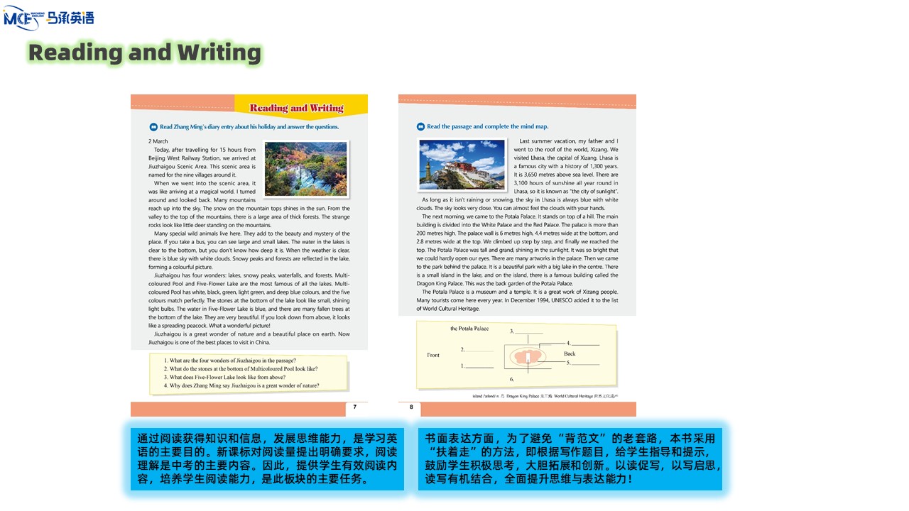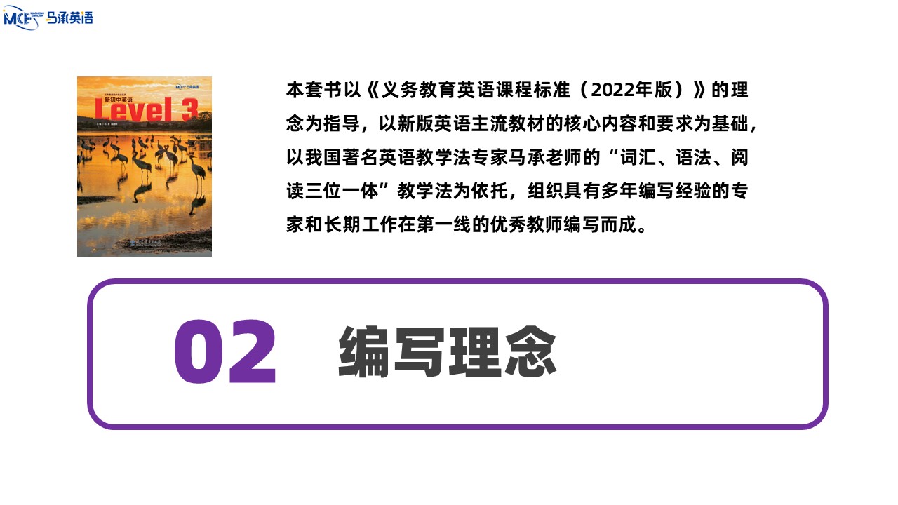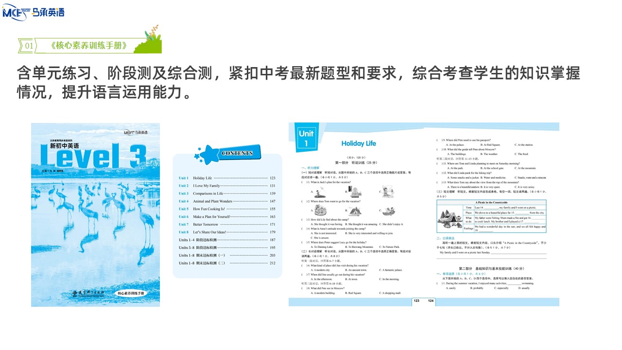 教材主编:马承 崔建斌 出 版 社:教育科学出版社 使用对象:初中八年级学生 课时安排:50课时 全套定价:82.00元 衔接教材:《新初中英语》Level 2——本套教材——《新初中英语》Level 4